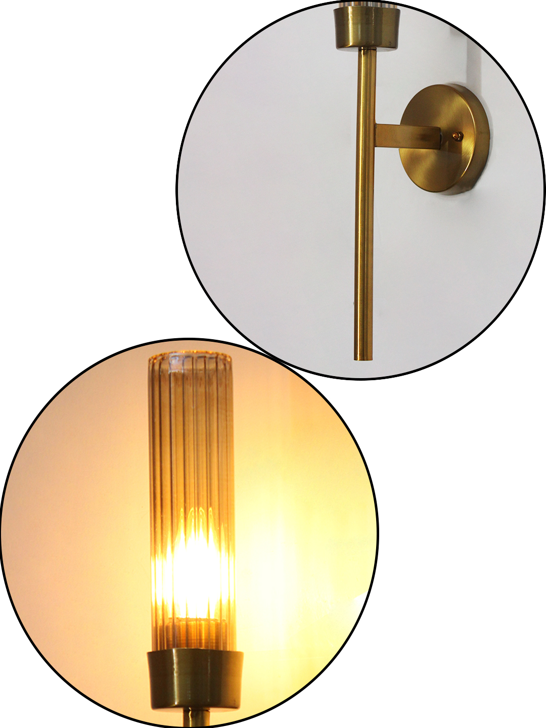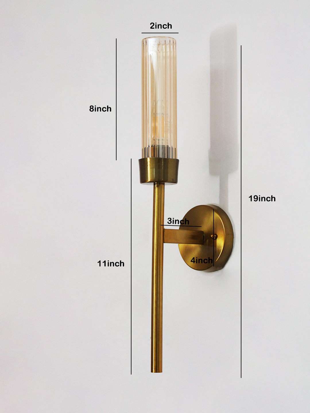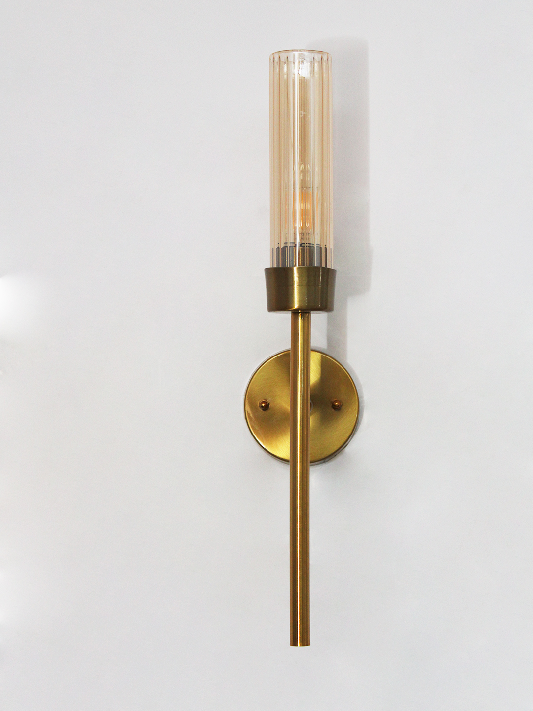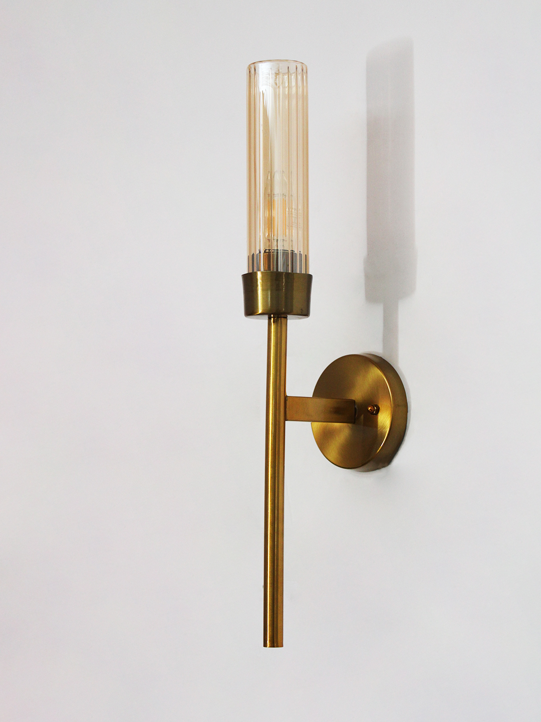 Linear wall lamp in brass finish with a slim vertical rod and ribbed amber glass cylindrical shade, mounted on a wall for modern decorative lighting