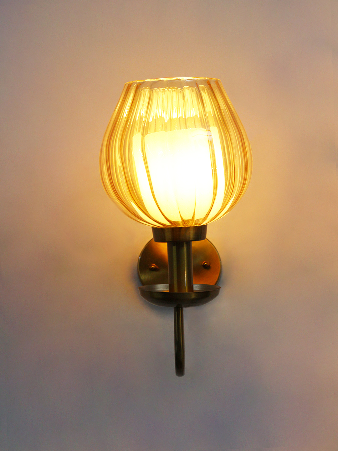 Ribbed Tulip Glass Wall Light with amber ribbed glass shade and brass finish curved arm decorative wall lamp for bedroom and living room