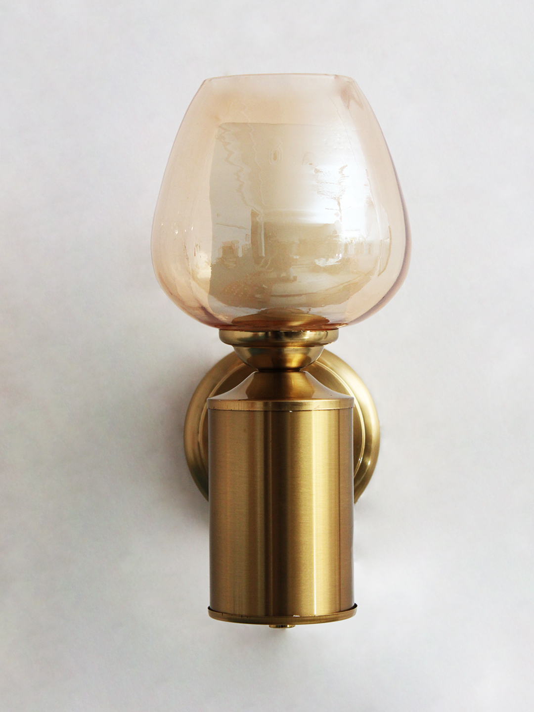 The brushed brass finish provides a rich, timeless contrast to the warm-toned glass, resulting in a refined aesthetic that works seamlessly with modern, transitional, and classic interiors. Its cylindrical metal body and round wall backplate offer a clean, balanced silhouette, while the short horizontal arm adds subtle architectural interest. The overall design feels elegant yet approachable, making it suitable for both residential and hospitality settings.