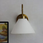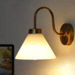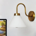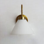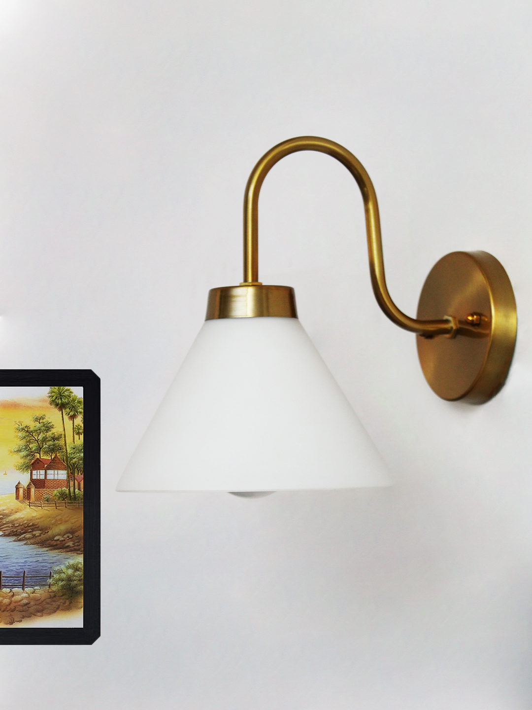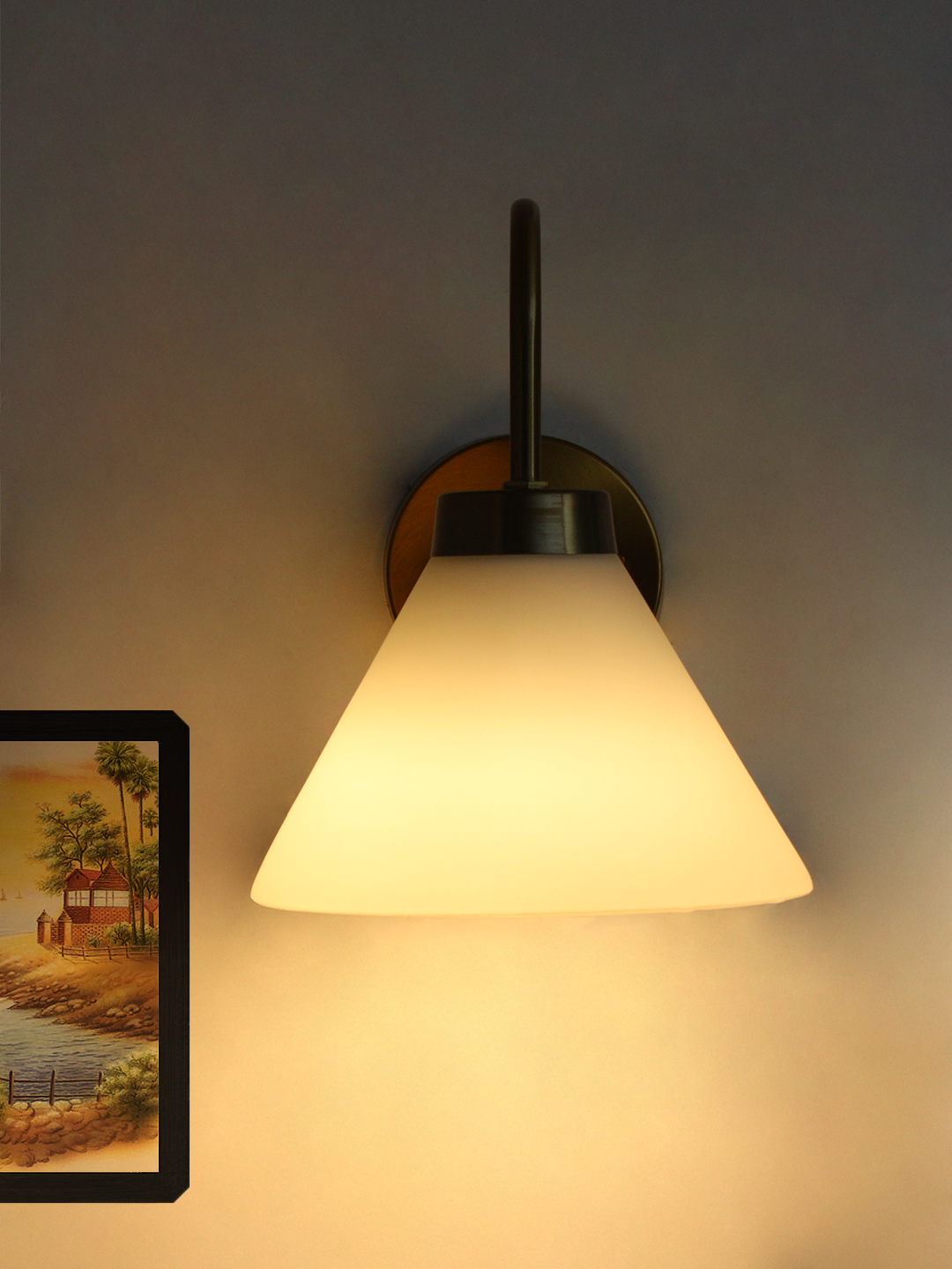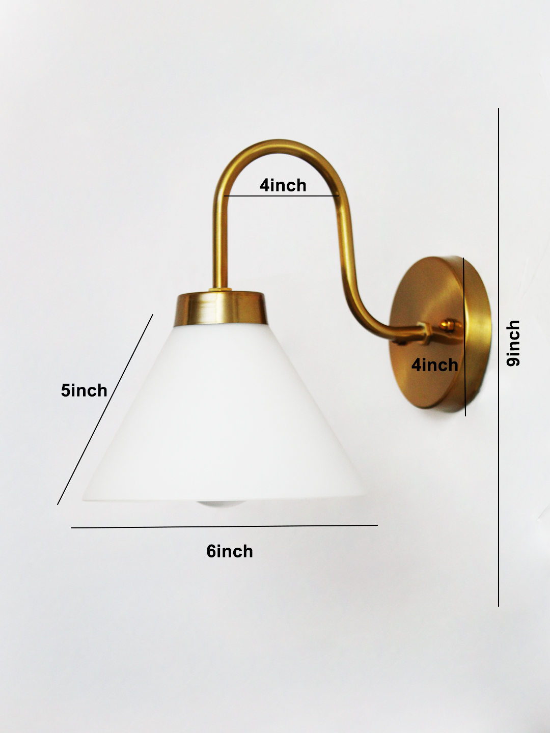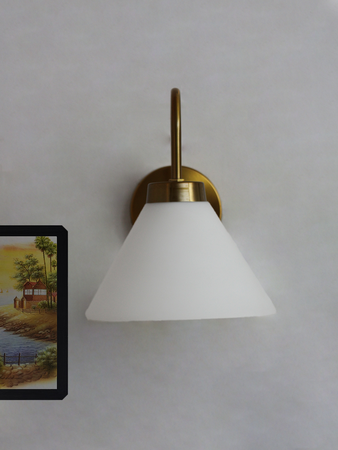 The sconce features a smooth, curved brass arm finished in a warm antique gold tone, lending a subtle touch of luxury to your walls. Its conical opal white glass shade softly diffuses light, providing balanced illumination that is easy on the eyes. The opaque glass ensures reduced glare while evenly spreading light across the space, making it ideal for ambient and task lighting alike.