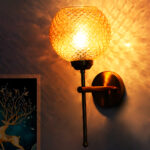 Brass wall light with textured amber glass shade and modern metal arm mounted on wall creating warm ambient lighting