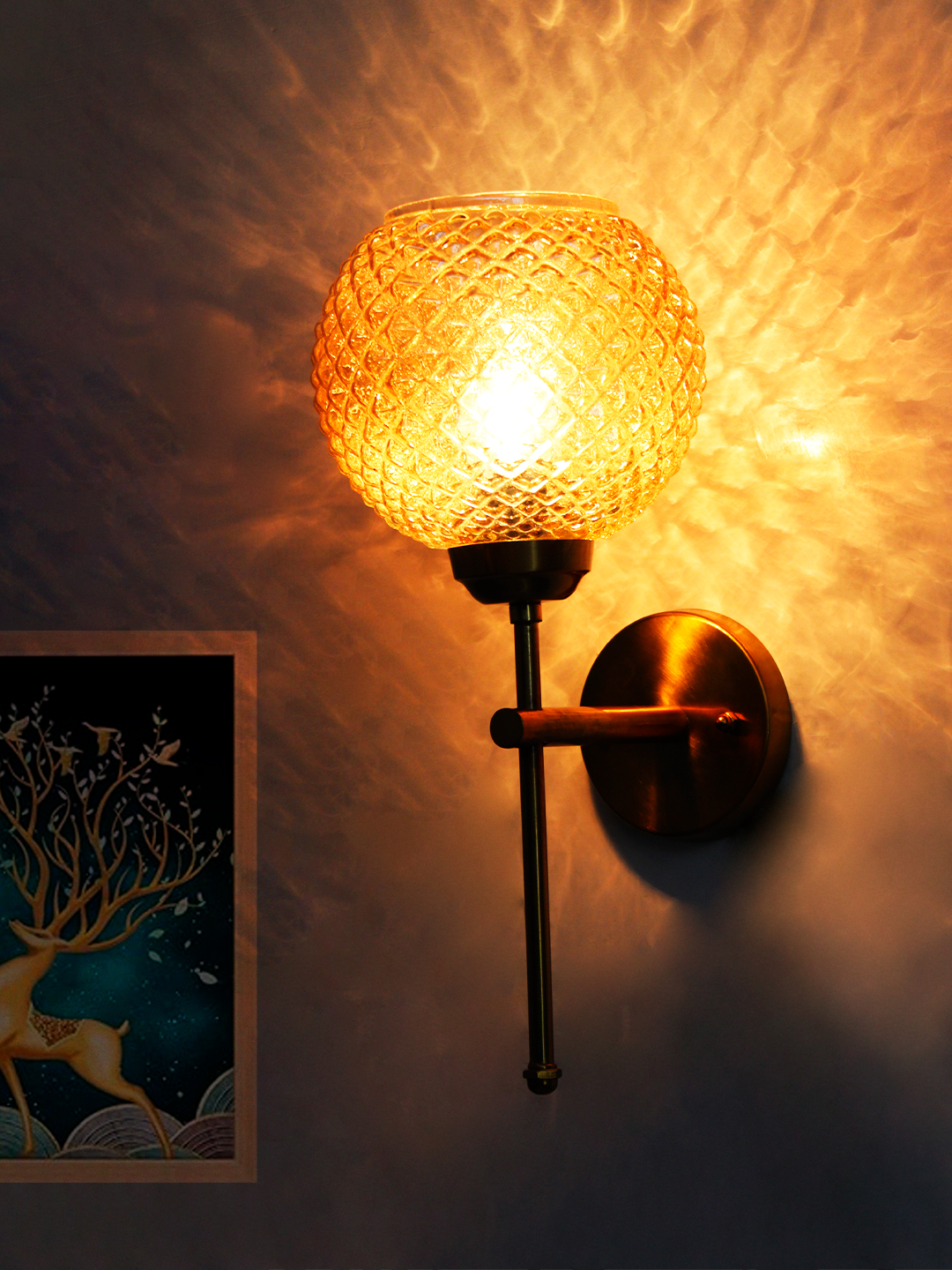 Enhance your interior lighting with this elegant brass wall light, designed to bring a perfect balance of style, warmth, and functionality to your space. Featuring a beautifully crafted textured glass shade, this wall sconce showcases a stunning diamond-cut pattern that adds depth and sophistication. The soft amber tint of the glass enhances the glow of the light, creating a warm and inviting ambiance that elevates any room.
