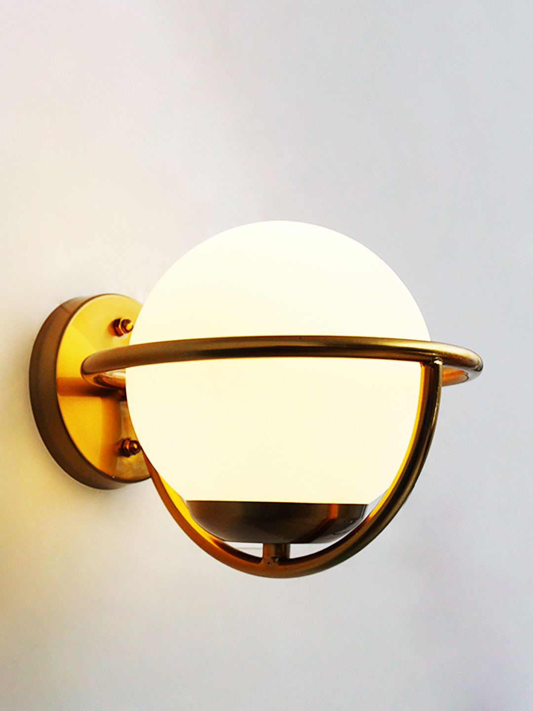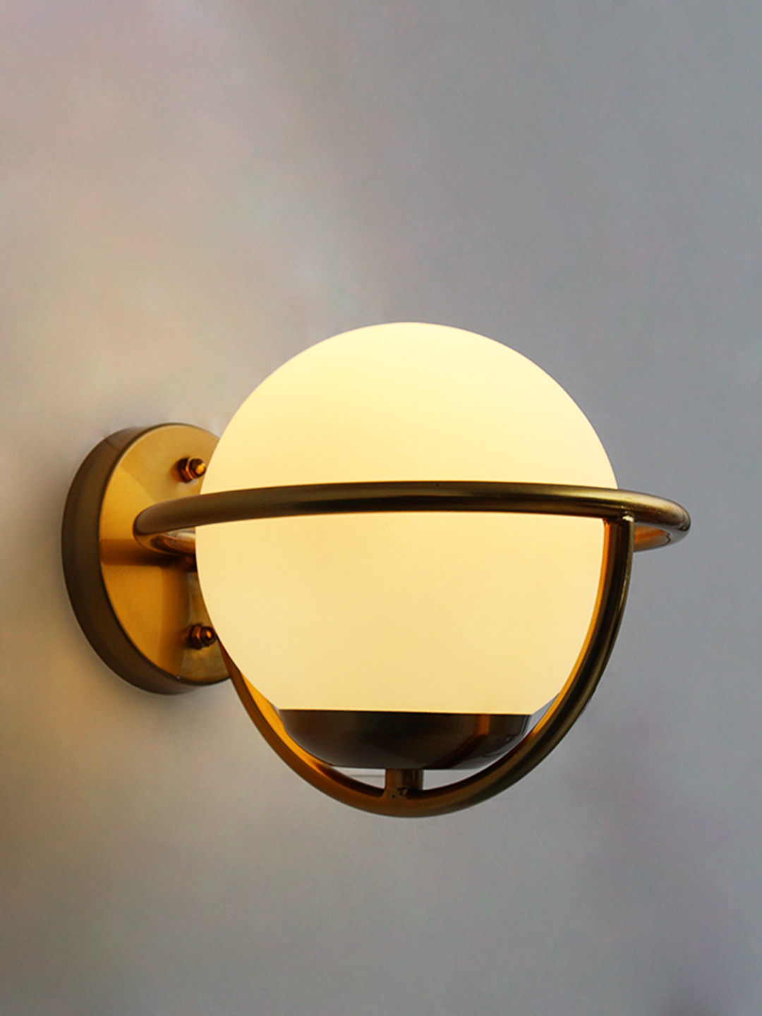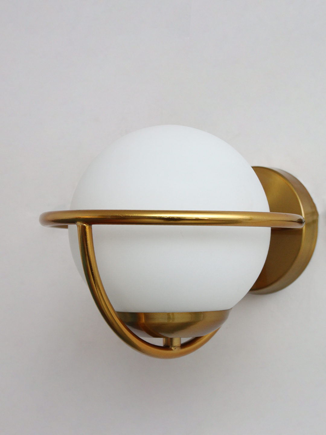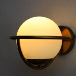 This luxury wall sconce showcases a unique orb-inspired design with a brass ring encircling the frosted glass globe, creating a balanced and sculptural silhouette ideal for modern, mid-century, minimalist, or transitional interiors. The smooth opal glass softens harsh lighting and adds a warm, inviting atmosphere, making it a standout feature in both residential and commercial applications, including hotels, boutiques, and upscale cafés.
