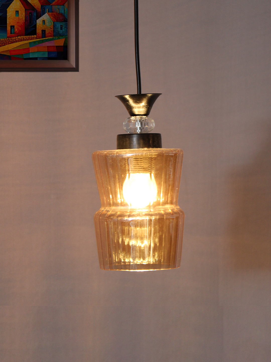 Bring warmth, elegance, and a refined modern touch to your interiors with this Fluted Amber Glass Pendant Light with Black Finish. Designed to blend contemporary aesthetics with a hint of vintage charm, this pendant lamp features a beautifully contoured amber-tinted glass shade that diffuses light softly, creating a cozy and inviting atmosphere. The transparent glass reveals the bulb within, enhancing the decorative appeal and making it an excellent choice for statement lighting.