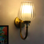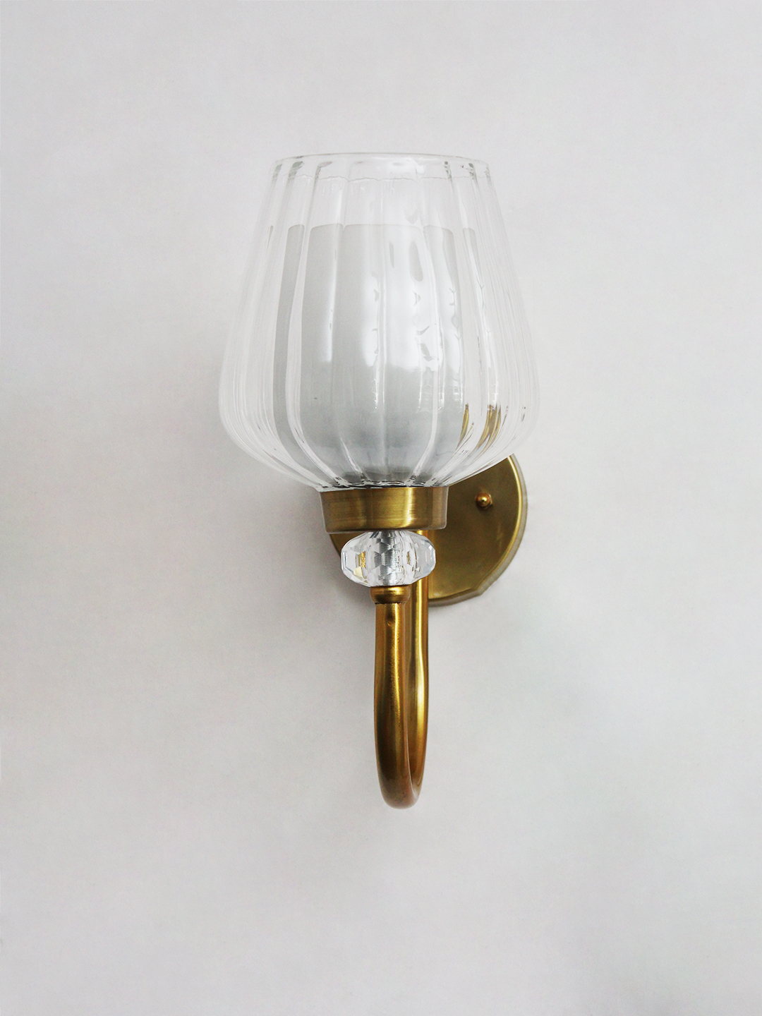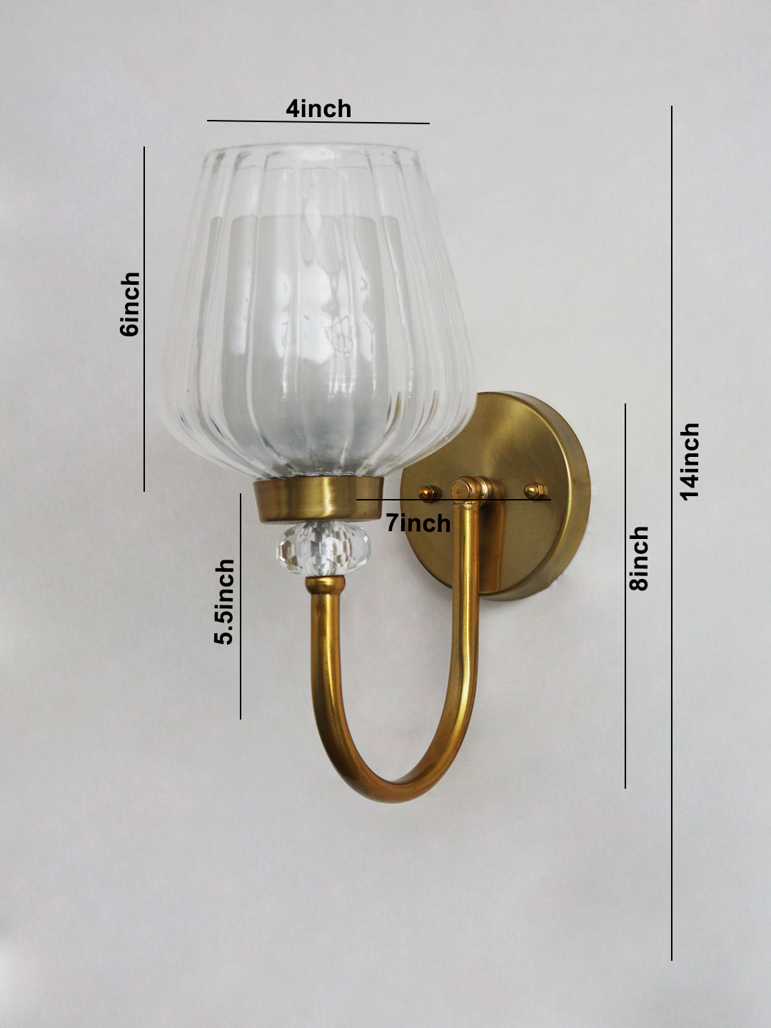 Elevate your interior décor with this Fluted Clear Tulip Glass Wall Sconce – Brass Finish, a perfect blend of classic charm and contemporary refinement. Designed to add warmth and sophistication to any space, this light fixture features a beautifully crafted antique brass-finish metal arm paired with a ribbed clear glass shade that softly diffuses light. The subtle crystal accent beneath the glass adds a touch of luxury, catching and reflecting light for a gentle, ambient glow.