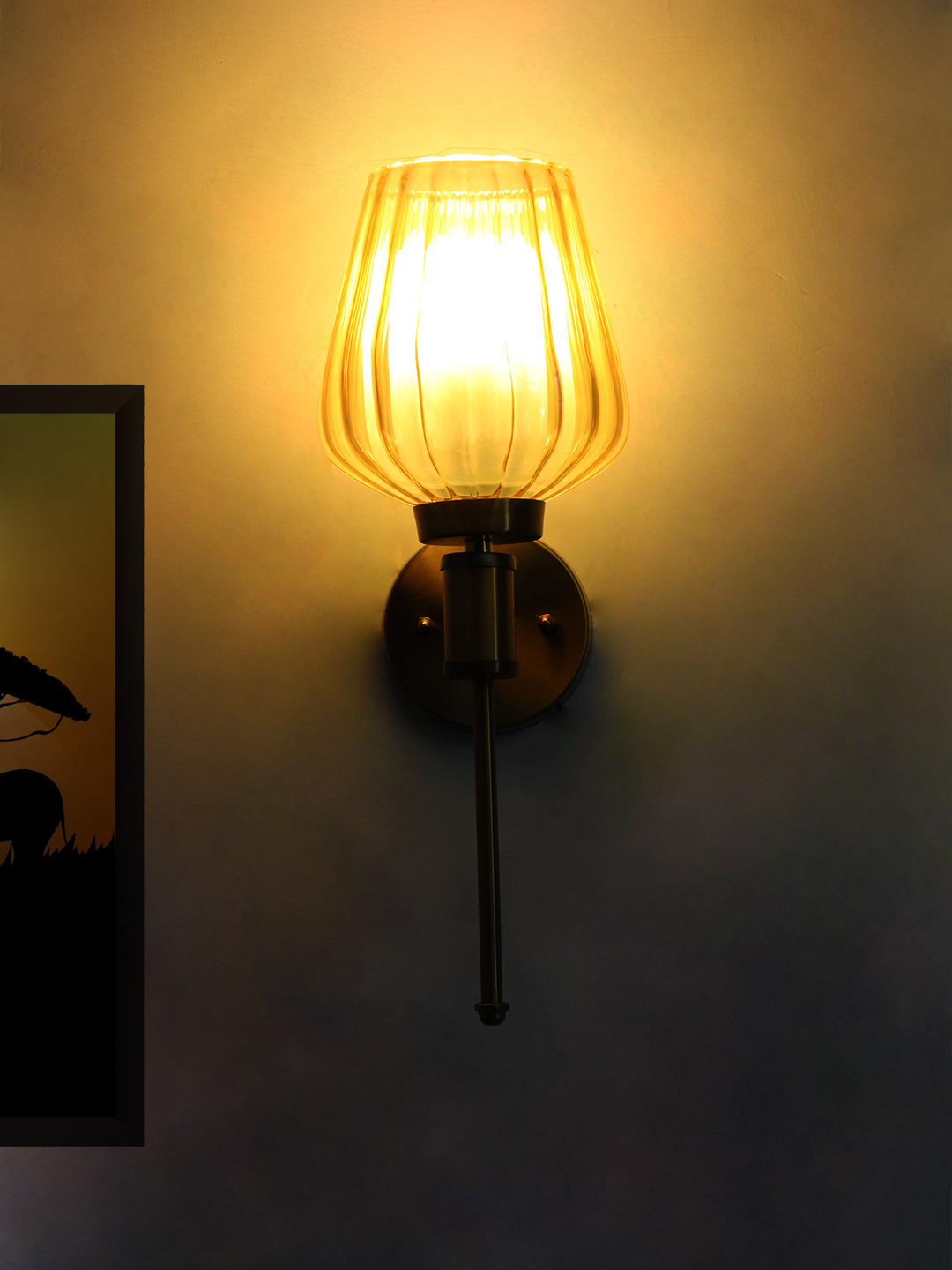 The vertically ribbed glass shade adds depth and visual interest while softly diffusing the light to create a warm, ambient glow. Its subtle amber tint enriches the illumination, making rooms feel inviting and comfortable without harsh brightness. When lit, the fluted detailing casts gentle highlights that elevate the overall atmosphere of the space.