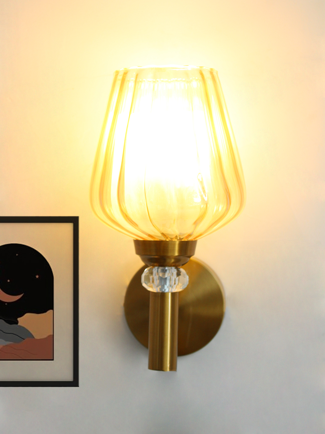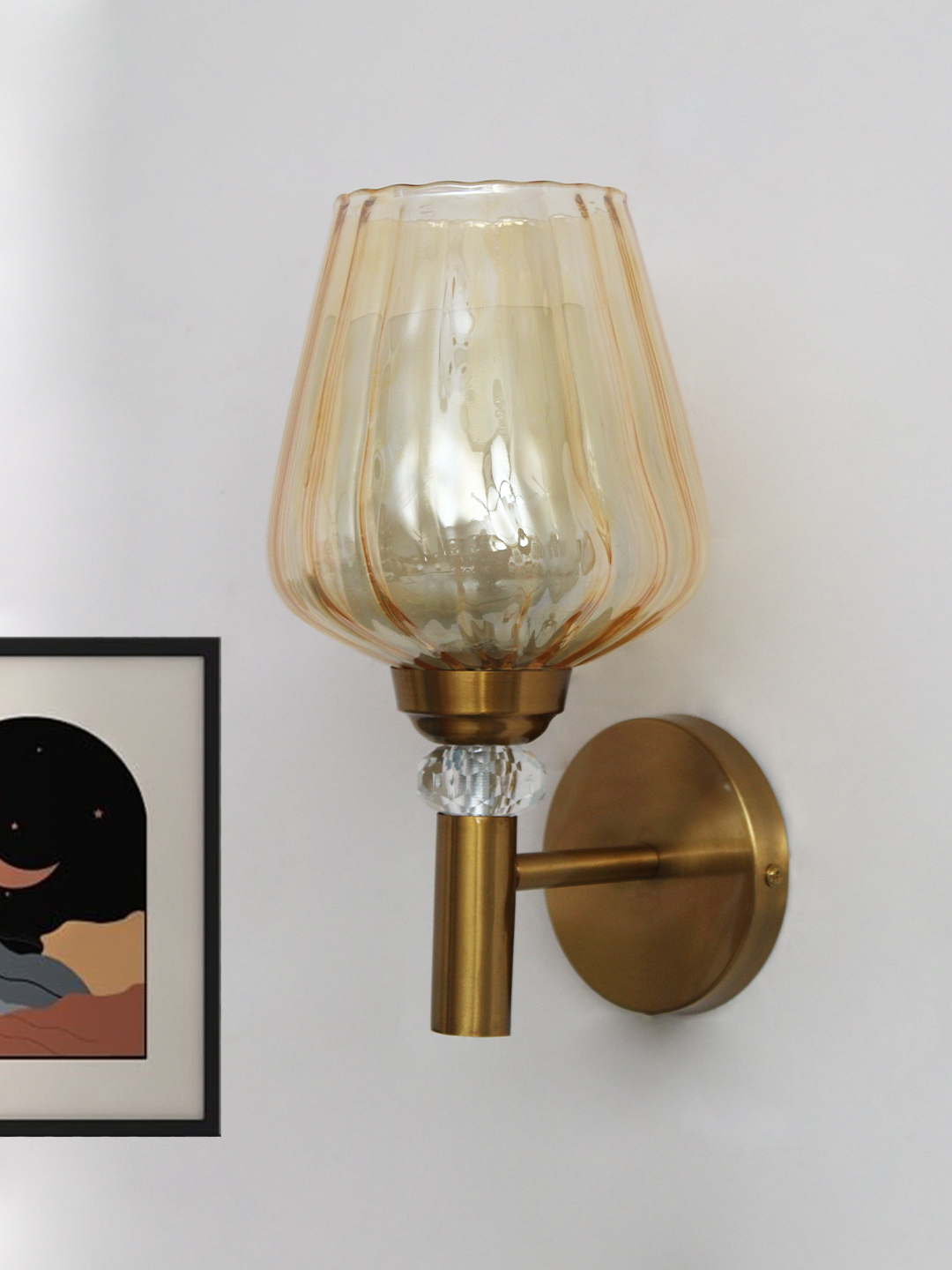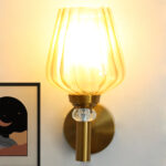 The sculpted glass shade gently diffuses light, creating a warm and inviting glow that adds depth and atmosphere to any room. Its subtle translucence allows the bulb to illuminate without harsh glare, making it ideal for ambient or accent lighting. The vertical fluted design of the glass adds visual texture and a sense of craftsmanship, while the brass wall mount introduces a luxurious, understated shine.