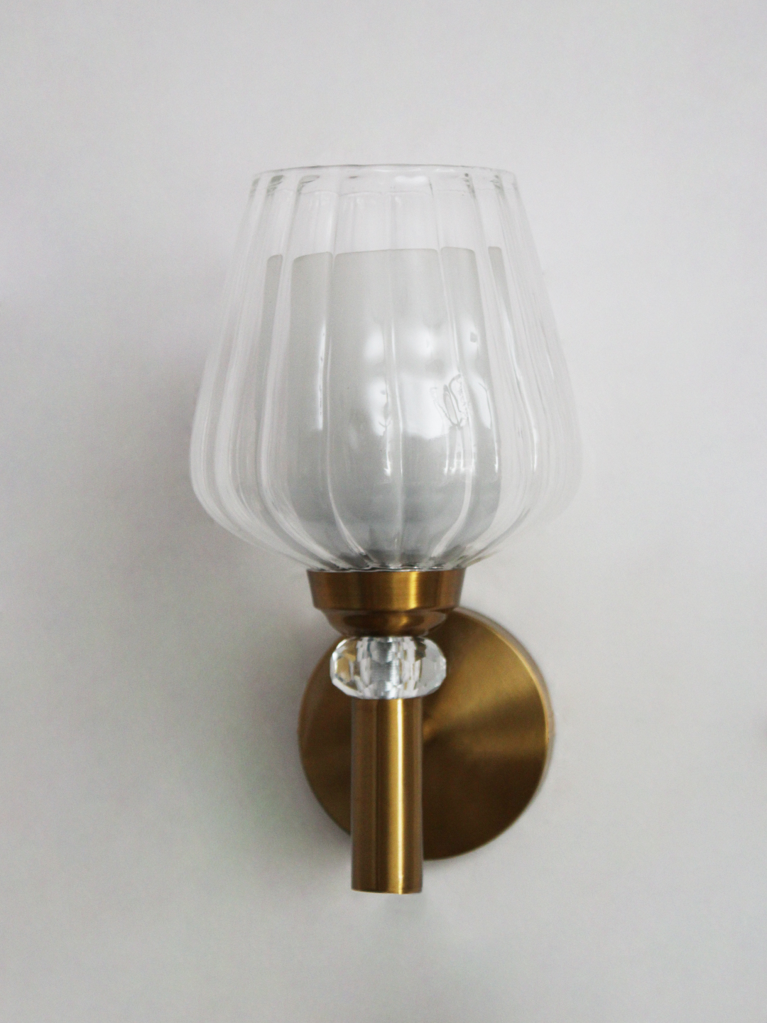 Finished in brushed brass, the metal arm and round backplate add a touch of understated luxury while maintaining a clean, contemporary profile. A crystal-style accent detail between the glass shade and the arm introduces an elegant sparkle, subtly reflecting light and elevating the overall design. The sturdy construction ensures durability, while the streamlined wall-mounted form keeps the look balanced and uncluttered.