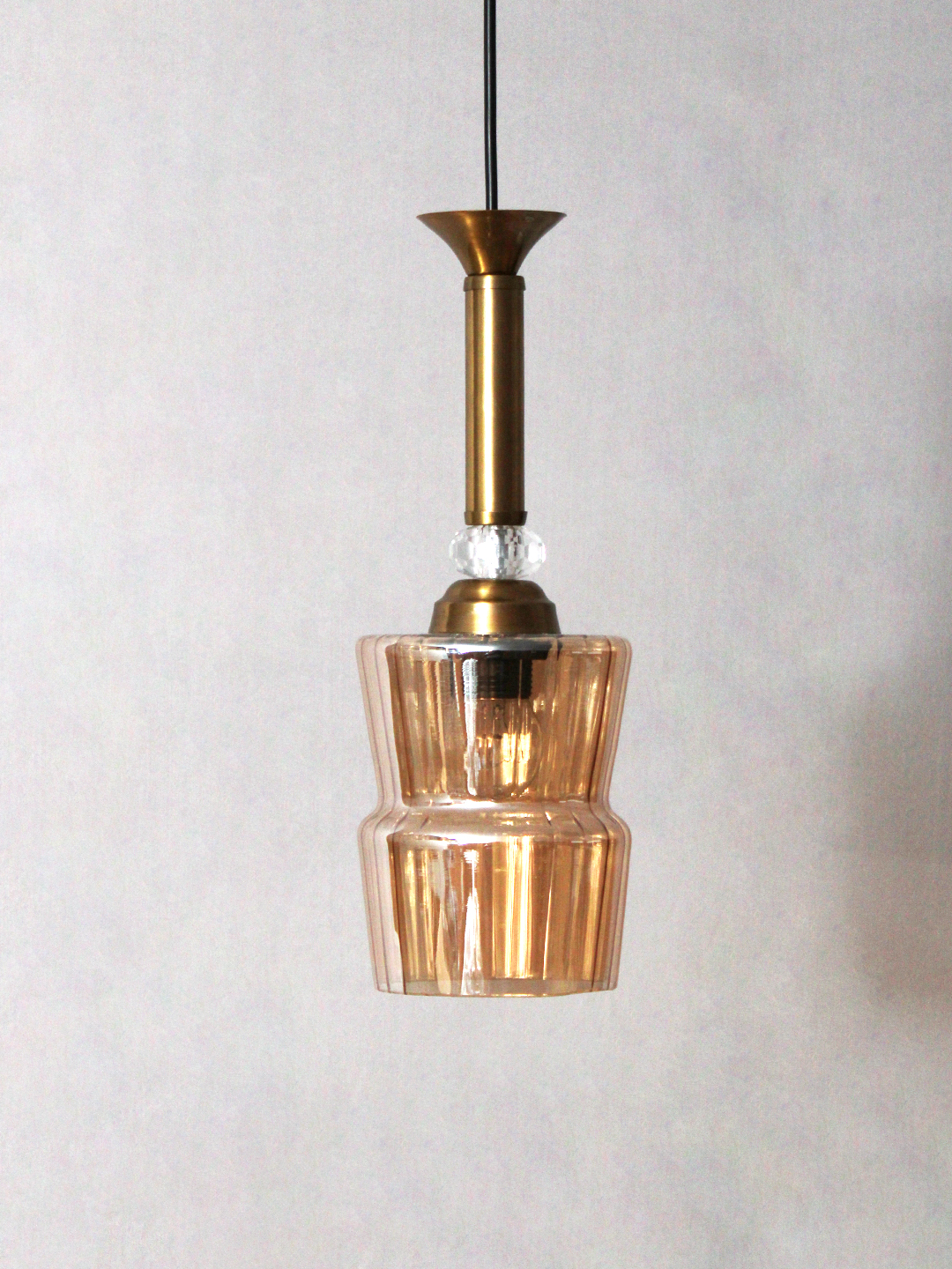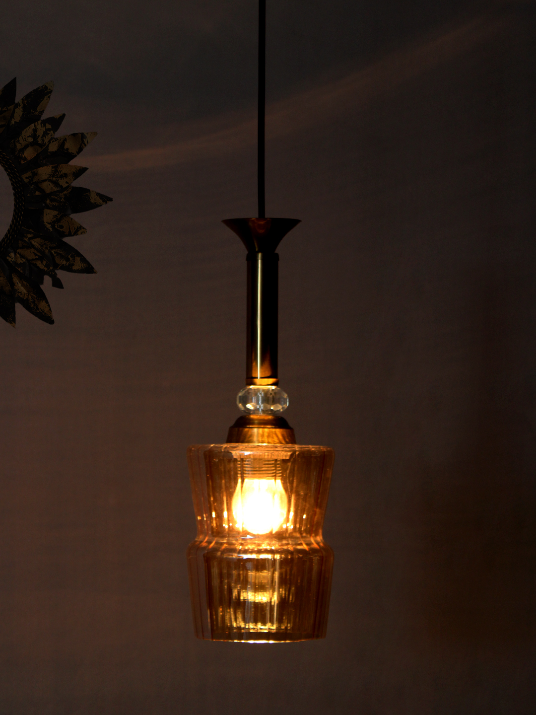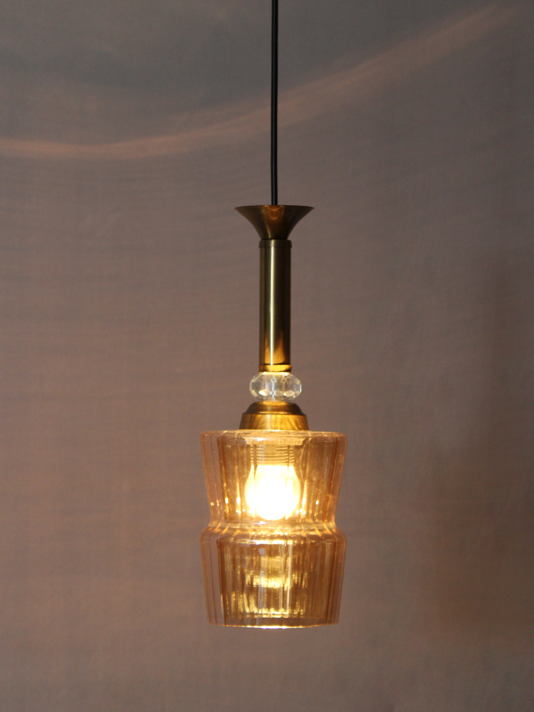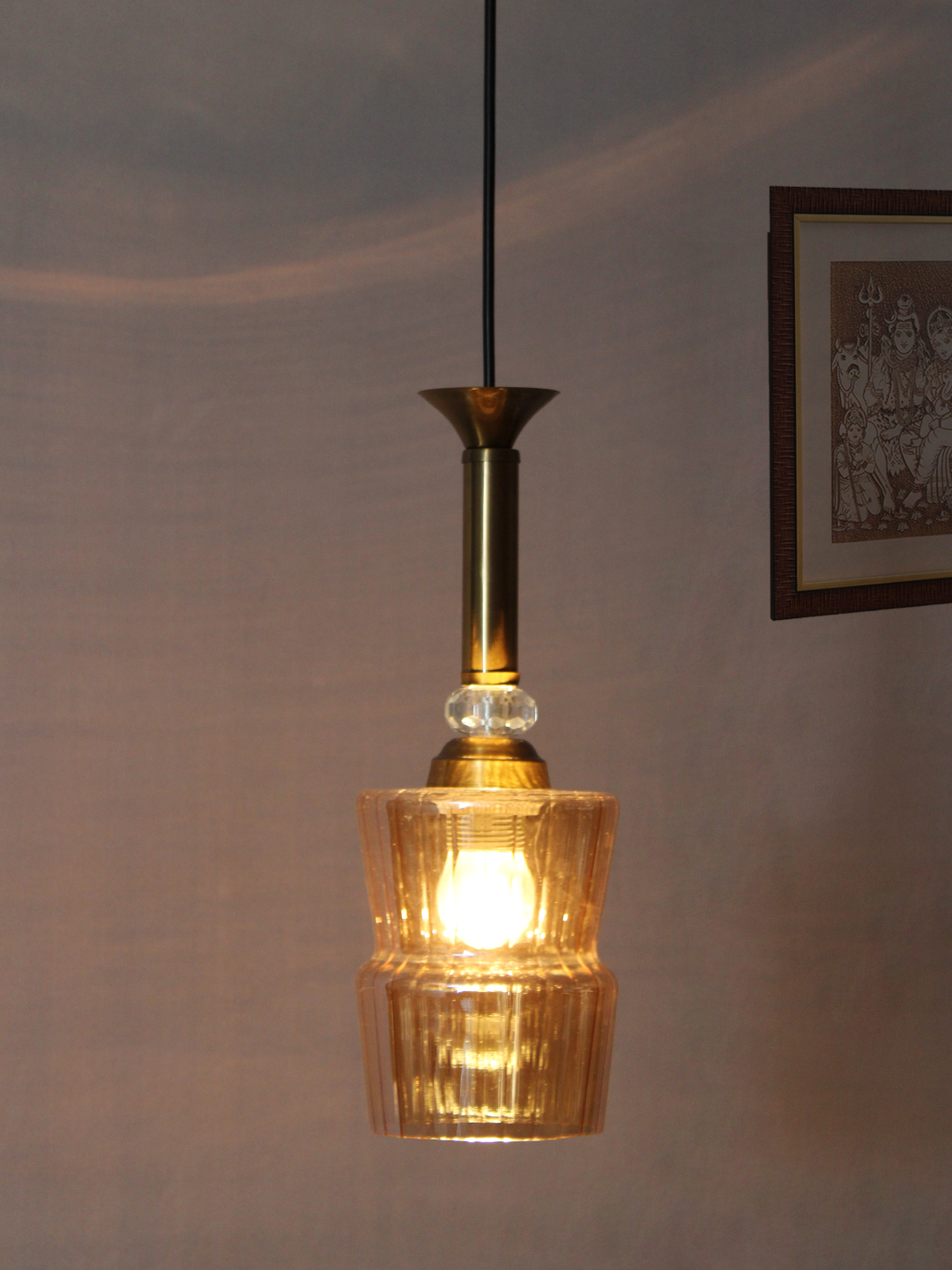 Designed to make a subtle yet striking statement, the sculpted glass diffuser refracts light evenly, casting a warm ambiance ideal for dining areas, kitchen islands, living rooms, bedrooms, or cozy café-style settings. The amber tint not only adds visual warmth but also reduces glare, making it perfect for both functional and mood lighting. The sturdy brass suspension rod and ceiling mount provide durability while complementing the vintage aesthetic. Its clean vertical profile and balanced proportions allow it to work seamlessly in interiors ranging from mid-century modern and art deco to industrial and contemporary décor.