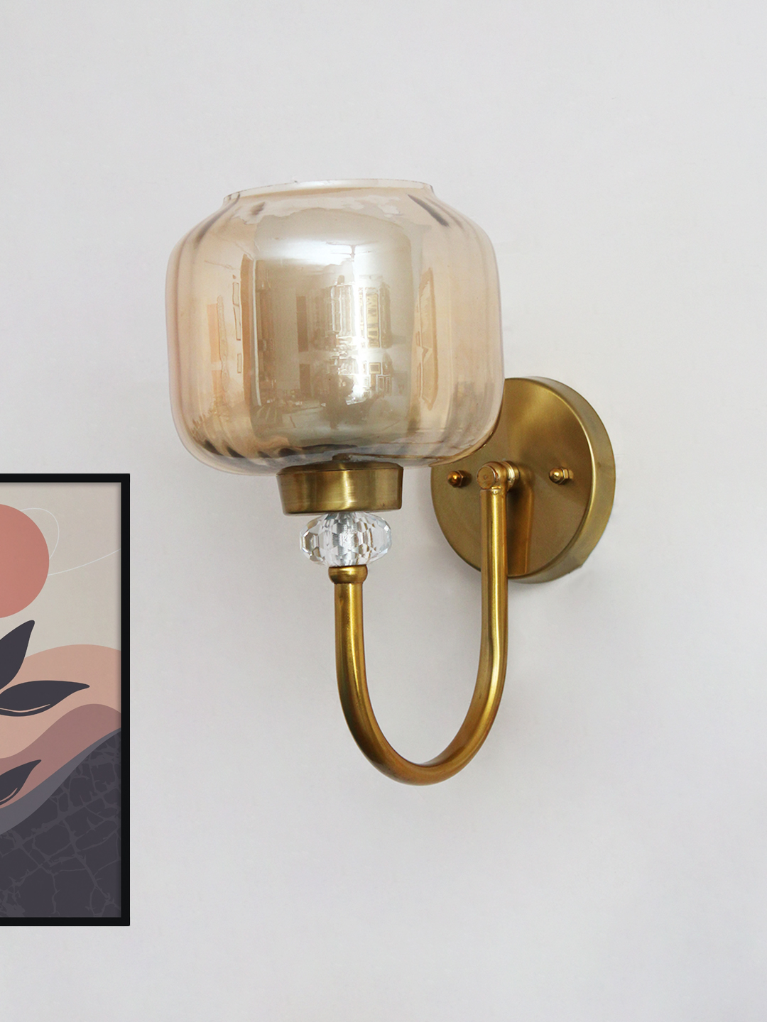The curved brass arm and circular wall plate are finished in a warm brushed tone, offering a sophisticated contrast to the glass and crystal elements. The gently arched arm creates a graceful silhouette, making the fixture visually striking from every angle while ensuring balanced proportions.